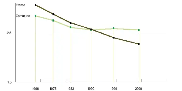 Le nombre de ménages[Note 3] tend à croître plus vite que la population : + 1,72 % par an en moyenne en France métropolitaine pour le nombre de ménages entre 1968 et 2009, + 0,74 % pour la population (tableau ci-après). Le nombre moyen de personnes par ménage tend en effet à baisser : égal à 3,06 en 1968, il n’est plus que de 2,4 en 1999 et de 2,27 en 2009[16]. La tendance est similaire pour la commune. Le nombre moyen de personnes par ménage tend également à baisser : égal à 2,84 en 1968, il n’est plus que de 2,59 en 1999 et de 2,56 en 2009[13].