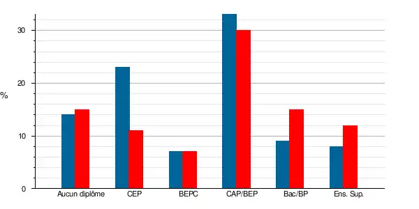 | Titulaires du certificat d'études primaires | 29 | 10,6 % | 46 | 23,2 % | 11,2 | 18,4 | 11,1 | 17,6 |