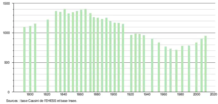 L'évolution du nombre d'habitants est connue à travers les recensements de la population effectués périodiquement dans la commune depuis 1793. Après avoir présenté un maximum en 1866 avec 1 404 habitants, la population de la commune diminue jusqu'en 1975 avec un minimum à 711 habitants puis croît modérément.