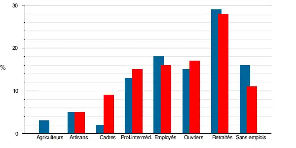 | Artisans, commerçants, chefs d'entreprise | 16 | 5,3 | 12 | 4,8 | 3,7 | 4,2 | 3,3 | 3,5 |