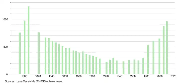 L'évolution du nombre d'habitants est connue à travers les recensements de la population effectués périodiquement dans la commune depuis 1793. Après avoir présenté un maximum en 1806 avec 1 229 habitants, la population de la commune diminue jusqu'en 1921 puis reste stable jusqu'en 1975 avant de connaître ensuite une forte croissance. Une réforme du mode de recensement permet à l'Insee de publier les populations légales des communes annuellement à partir de 2006. Pour les communes de moins de 10 000 habitants, les recensements ont lieu tous les cinq ans, les populations légales intermédiaires sont quant à elles estimées par calcul[1]. Le premier recensement exhaustif de la commune entrant dans le cadre de ce nouveau dispositif a eu lieu en 2005[2].