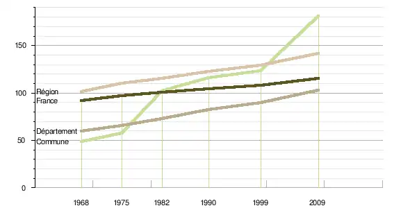 Le taux de mortalité est quant à lui passé de 15,3 ‰ sur la période 1968-1975 à 4,1 ‰ sur la période 1999-2009[5]. Celui du département était sur cette dernière période de 7,6 ‰ et celui de la France de 8,8 ‰[8].