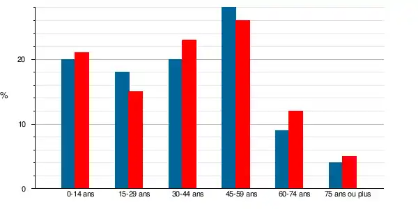 La population a vieilli entre 1999 et 2009, le taux des personnes de 60 ans et plus passant de 13 % à 17 %, à l'instar des populations du département et de la France qui sont aussi passées respectivement de 18 à 20 % pour le Département et de 20 à 23 % pour la France métropolitaine.
