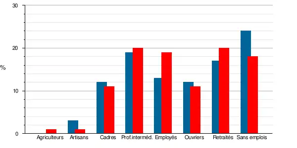 | Artisans, commerçants, chefs d'entreprise | 4 | 0,5 | 16 | 3,2 | 3,7 | 4,2 | 3,3 | 3,5 |