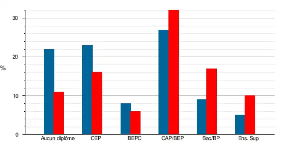 | Aucun diplôme | 51 | 10,9 % | 90 | 22,2 % | 18,3 | 19,2 | 18,3 | 20 |