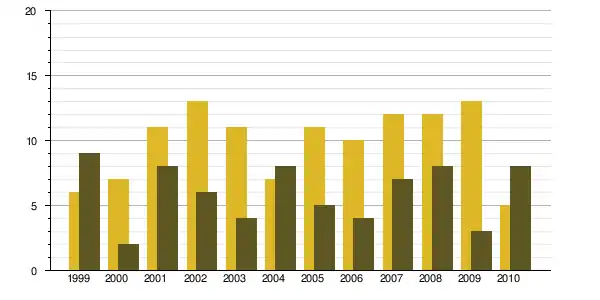 | 1968 à 1975 | 1975 à 1982 | 1982 à 1990 | 1990 à 1999 | 1999 à 2009 | ||