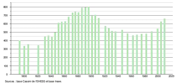 Le taux de mortalité est quant à lui passé de 14,8 ‰ sur la période 1968-1975 à 10,3 ‰ sur la période 1999-2009[5]. Celui du département était sur cette dernière période de 8,5 ‰ et celui de la France de 8,8 ‰[8].
