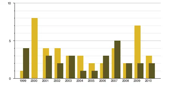 | 1968 à 1975 | 1975 à 1982 | 1982 à 1990 | 1990 à 1999 | 1999 à 2009 | ||
