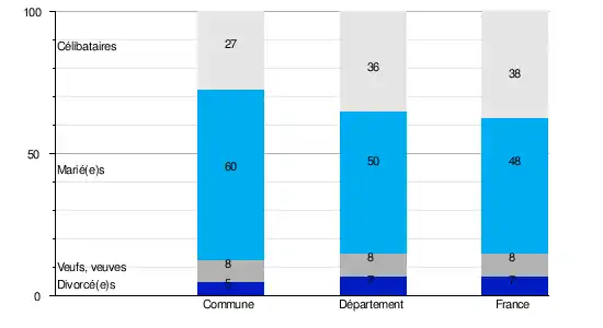 L'état matrimonial légal désigne, selon l'Insee, la situation conjugale d'une personne au regard de la loi : célibataire, mariée, veuve, divorcée[Note 2].En 2009, la commune comptait 27,1 % de célibataires, 59,9 % de personnes mariées, 7,9 % de veufs ou veuves et 5,1 % de divorcé(e)s[13]. Le taux de personnes mariées apparaît ainsi très supérieur à celui du département (49,8 %)[14] mais aussi de la France (47,5 %)[15].