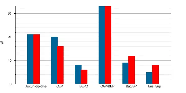 | Titulaires du BEPC, brevet des collèges | 136 | 5,7 % | 168 | 7,8 % | 6,1 | 7,7 | 6,3 | 8,1 |