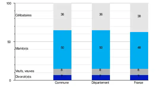 L'état matrimonial légal désigne, selon l'Insee, la situation conjugale d'une personne au regard de la loi : célibataire, mariée, veuve, divorcée[Note 2].En 2009, la commune comptait 35,8 % de célibataires, 49,9 % de personnes mariées, 7,5 % de veufs ou veuves et 6,8 % de divorcé(e)s[13]. Le taux de personnes mariées apparaît ainsi supérieur à celui du département (49,8 %)[14] mais aussi de la France (47,5 %)[15].