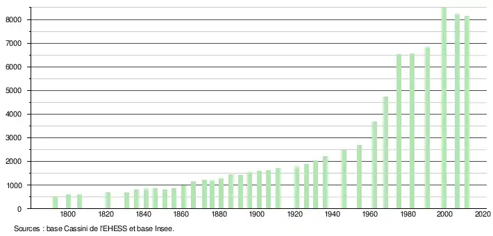 L'évolution du nombre d'habitants est connue à travers les recensements de la population effectués périodiquement dans la commune depuis 1793. Après avoir crû faiblement au XIXe siècle, la population de la commune croît plus fortement des années 1940 aux années 1980 avant de se stabiliser.
