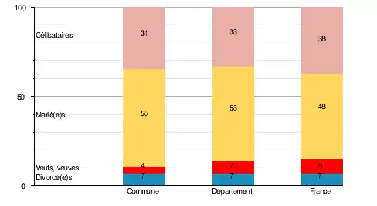 En 2009, la commune comptait 34 % de célibataires, 55,4 % de personnes mariées, 3,7 % de veufs ou veuves et 6,9 % de divorcé(e)s[11]. Le taux de personnes mariées apparaît ainsi supérieur à celui du département (52,5 %)[12] mais aussi de la France (47,5 %)[13].