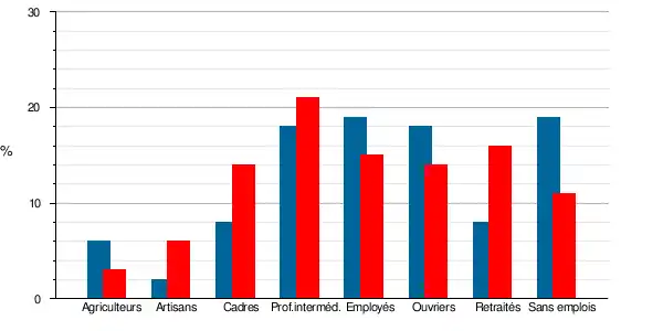 | Cadres et professions intellectuelles supérieures | 55 | 13,5 | 28 | 8,4 | 8 | 5,9 | 8,7 | 6,7 |