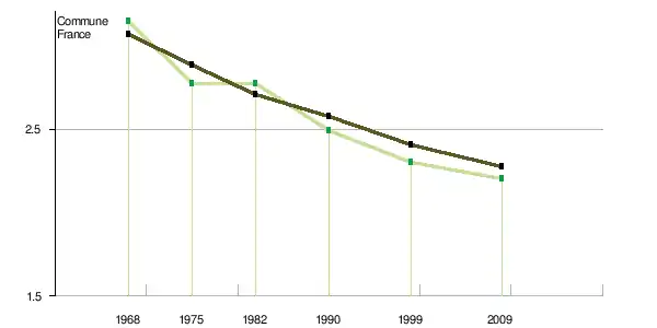 Le nombre de ménages[Note 3] tend à croître plus vite que la population : + 1,72 % par an en moyenne en France métropolitaine pour le nombre de ménages entre 1968 et 2009, + 0,74 % pour la population (tableau ci-après). Le nombre moyen de personnes par ménage tend en effet à baisser : égal à 3,06 en 1968, il n’est plus que de 2,4 en 1999 et de 2,27 en 2009[16]. La tendance est similaire pour la commune. Le nombre moyen de personnes par ménage tend également à baisser : égal à 3,14 en 1968, il n’est plus que de 2,3 en 1999 et de 2,2 en 2009[13].
