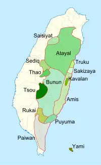 | Amis | Atayal | Bunun | Da'o | Kavalan | Paiwan | Puyuma | Rukai | Saisiat | Truku | Thao | Tsou |