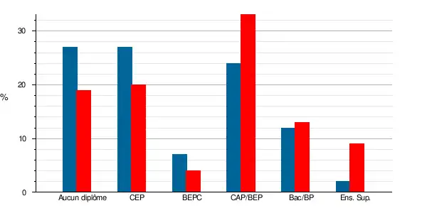 | Titulaires du certificat d'études primaires | 37 | 19,9 % | 54 | 27,4 % | 12,4 | 19 | 11,1 | 17,6 |