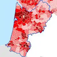 Mais la région Aquitaine a conservé un écart négatif assez important avec la moyenne française [23]. Récemment, comme dans l'ensemble de la France, elle a un peu grimpé depuis la fin des années 1990 sans parvenir jusqu'à présent à se rapprocher de la moyenne nationale.
