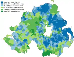 Il y a une forte corrélation entre religion et identité nationale, les catholiques se reconnaissant plus souvent irlandais et les protestants britanniques. Ce n'est pas une règle absolue, et les minorités catholiques dans les zones à majorité protestante ont plus souvent tendance à se reconnaître britanniques. La plupart des non-religious, athées, agnostiques ou sans religion se considèrent comme britanniques.