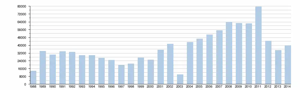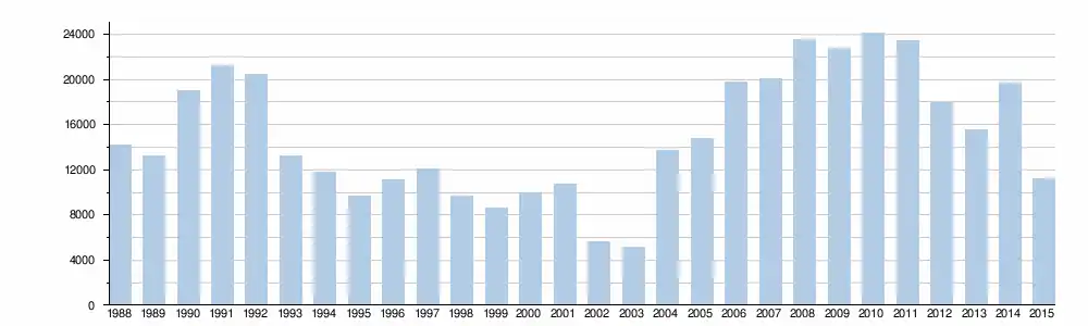 | Année | 2000 | 2001 | 2002 | 2003 | 2004 | 2005 | 2006 | 2007 | 2008 | 2009 | 2010 | 2011 | 2012 | 2013 | 2014 | 2015 | 2016 | 2017 | 2018 | 2019 |