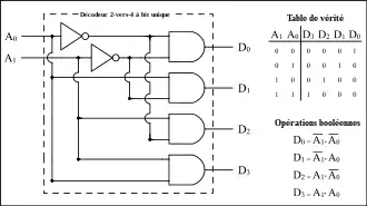 Ci-dessous, un décodeur à 2 entrées et 4 sorties. La construction (voir les entrées des portes ET) suit la progression binaire : 00, 01, 10, 11.