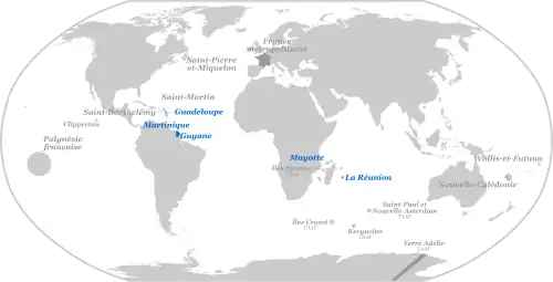 En Martinique[1], en Guyane[2] et à Mayotte[3], les compétences départementales et régionales sont exercées par des collectivités territoriales uniques, qui remplacent départements et régions. En Guadeloupe[4] et à La Réunion[5], elles restent dévolues aux collectivités départementales et régionales.