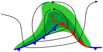 Le système dépressionnaire se déplace toujours, mais un ralentissement commence à se faire sentir. Lorsque le front froid rejoint le front chaud, il commence à repousser l'air doux en altitude près de la dépression. Une partie de cet air est alors forcée de s'élever, créant front occlus et trowal[3],[4]. À ce stade, l'air chaud est presque complètement coupé de la surface dans la dépression. La frontolyse laisse une circulation cyclonique dans l'air froid situé sous le creux d'air chaud. Il s'ensuit, au centre, une remontée de la pression et un affaiblissement tel, que le système deviendra stationnaire dans bien des cas.