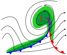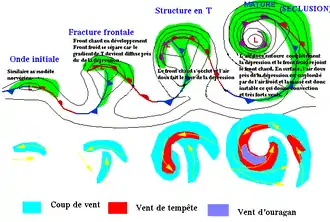 Autour de la dépression, figure 3, le flux d'air est cyclonique, c'est-à-dire que la rotation amène l'air doux de la masse chaude vers les pôles et l'air froid vers l'équateur quel que soit l'hémisphère (voir Circulation atmosphérique). Ceci transforme ainsi la zone frontale stationnaire en un front chaud et un front froid dans le quadrant sud de la dépression. Habituellement, l'advection froide causée par le front froid est plus grande que celle du front chaud et le premier rattrape graduellement le second[3],[4].