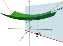 En associant à la fonction la surface (S) d'équation cartésienne réduite z = f(x,y), la notion de dérivée directionnelle dans la direction d'un vecteur unitaire en un point de U peut être interprétée ainsi : le plan vertical contenant la droite passant par A et dirigée par h coupe la surface (S) selon la courbe paramétrée (C) :