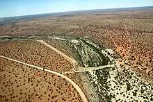 Paysage aride à Acacia luederitzii entre Mariental (Namibie) et la frontière du Botswana en septembre 2001. | |