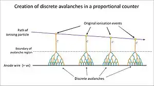 Les compteurs proportionnels fonctionnent à une tension légèrement plus élevée, permettant ainsi la création de décharges (ou avalanches) de Townsend. Chaque paire d'ions reçue dans la "plage de détection proportionnelle", ne provoque qu'une unique avalanche de sorte que le courant de sortie soit proportionnel au nombre de particules incidentes[2]. La possibilité de la mesure de l'énergie des particules est particulièrement utile lors de l'utilisation de grandes surfaces planes pour la détection et la discrimination des particules alpha et bêta, telles que celles utilisées pour contrôler les équipements personnels.