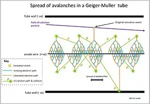 Les tubes Geiger-Müller sont les principaux composants des compteurs Geiger. Ils fonctionnent à des tensions encore plus élevées, sélectionnées de telle sorte que chaque paire d'ions crée de nombreuses avalanches par l'émission de photons UV. Ces dernières se propagent le long du fil d'anode, et le volume de gaz adjacent s'ionise à partir de ne serait-ce qu'une seule création de paire d'ions[2]. Le courant produit est transmis à l'électronique de traitement qui peut fournir un affichage visuel ou sonore (comme c'est souvent le cas avec les appareils portatifs produisant des "clics" caractéristiques) du taux de comptage ou de la dose de rayonnement.