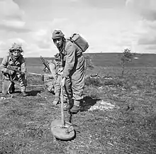 Fantassins de la British Army s'entrainant avec un détecteur de mine dans le Dorset le 7 mai 1943.
