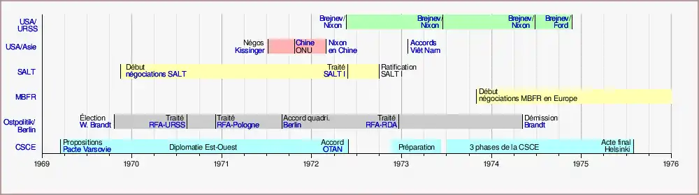 La détente Est-Ouest se construit entre 1969 et 1975 autour de plusieurs dimensions en parallèle. Entre les États-Unis et l'URSS elle se traduit par la reprise du dialogue, symbolisée par quatre sommets, un premier accord de limitation des armes nucléaires stratégiques (SALT I) et l'ouverture de négociations sur les forces conventionnelles en Europe (MBFR). La visite de Nixon en Chine communiste illustre de façon spectaculaire la reprise des relations, interrompues depuis 1949. Les accords de Paris marquent la fin de l'engagement américain au Viet Nâm. En Europe, l'Ostpolitik menée par Willy Brandt normalise les relations de la RFA avec l'URSS, la RDA et la Pologne. Elle ouvre la porte à l'ouverture de la Conférence sur la sécurité et la coopération en Europe.
