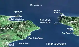 Le détroit de Gibraltar (en arabe : مضيق جبل طارق, mudiq jabal tariq, en amazighe standard marocain : ⴰⴳⵔⵉⵍⴻⵍ ⵏ ⵓⴷⵔⴰⵔ ⵏ ⵜⴰⵔⵉⵇ[1], Agrilel n udrar n Tariq, en anglais Strait of Gibraltar, en espagnol Estrecho de Gibraltar) est situé au sud de l'Espagne, au nord du Maroc, à l'est de l'océan Atlantique et dans l'Ouest de la mer Méditerranée. C'est le seul passage maritime entre l'océan Atlantique et la mer Méditerranée, dont il constitue la partie la plus occidentale. Il est large de 14 km et profond d'environ 1 000 m. Le détroit fait partie des eaux internationales. Dans l'Antiquité, ce détroit était appelé « les colonnes d'Hercule ». Il doit son nom de Gibraltar à une déformation du mot arabe « djebel Tarik » qui signifie « montagne de Tarik », ce dernier étant le prénom du général musulman Tariq ibn Ziyad, qui, en avril 711, franchit le détroit pour conquérir la péninsule Ibérique.