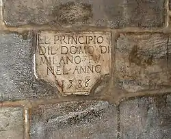 Comme en témoigne la richesse des archives, le premier ingénieur en chef est Simone d’Orsenigo. Il s’entoure d'autres maîtres lombards et ils commencent dès 1388 les murs de périmètre. Entre 1389 et 1390 le Français Nicolas de Bonaventure est chargé de concevoir les fenêtres[3].