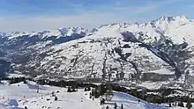 Le dôme de Vaugelaz avec derrière lui la Pierra Menta encadrée par la Grande Paréi à gauche et le Roignais à droite depuis Peisey-Vallandry de l'autre côté de la vallée de la Tarentaise au sud-est. | |||