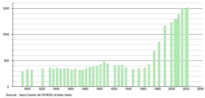 L'évolution du nombre d'habitants est connue à travers les recensements de la population effectués dans la commune depuis 1793. Pour les communes de moins de 10 000 habitants, une enquête de recensement portant sur toute la population est réalisée tous les cinq ans, les populations légales des années intermédiaires étant quant à elles estimées par interpolation ou extrapolation[31]. Pour la commune, le premier recensement exhaustif entrant dans le cadre du nouveau dispositif a été réalisé en 2004[32].
