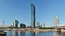 Haute de 250 mètres, DC Tower 1[5] inaugurée le 26 février 2014, marque la première étape d’un vaste projet d’aménagement urbain sur les rives du Danube, dans le quartier de Donau City situé en périphérie de la capitale autrichienne. Une seconde tour de 180 mètres doit venir s’imbriquer visuellement dans la première, comme un bloc fracturé que l’on a écarté. Au total les deux tours formeront un ensemble programmatique mixte de 760 000 m2.