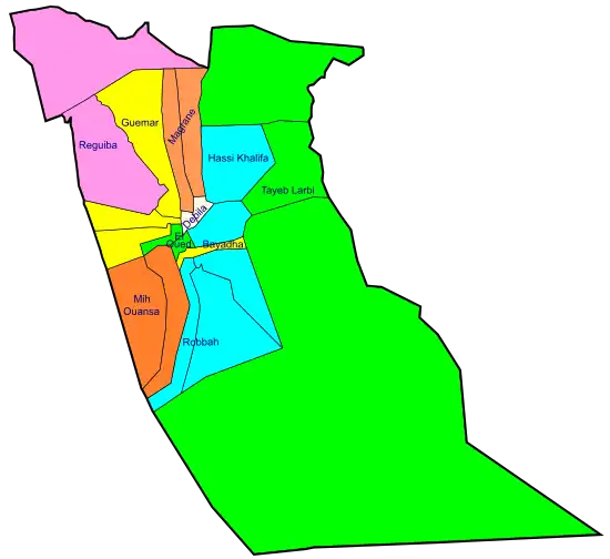 La wilaya d'El Oued compte dix daïras (circonscriptions administratives) depuis 2019, chacune comprenant plusieurs communes pour un total de vingt-deux communes[1].