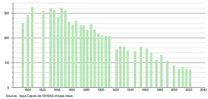 L'évolution du nombre d'habitants est connue à travers les recensements de la population effectués dans la commune depuis 1793. Pour les communes de moins de 10 000 habitants, une enquête de recensement portant sur toute la population est réalisée tous les cinq ans, les populations légales des années intermédiaires étant quant à elles estimées par interpolation ou extrapolation[14]. Pour la commune, le premier recensement exhaustif entrant dans le cadre du nouveau dispositif a été réalisé en 2006[15].