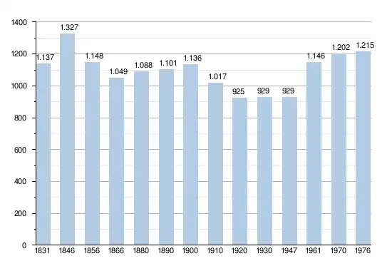 Les chiffres des années 1831 à 1970 tiennent compte des chiffres des anciennes communes fusionnées.