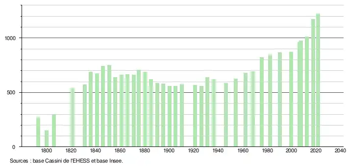 L'évolution du nombre d'habitants est connue à travers les recensements de la population effectués dans la commune depuis 1793. Pour les communes de moins de 10 000 habitants, une enquête de recensement portant sur toute la population est réalisée tous les cinq ans, les populations légales des années intermédiaires étant quant à elles estimées par interpolation ou extrapolation[19]. Pour la commune, le premier recensement exhaustif entrant dans le cadre du nouveau dispositif a été réalisé en 2007[20].