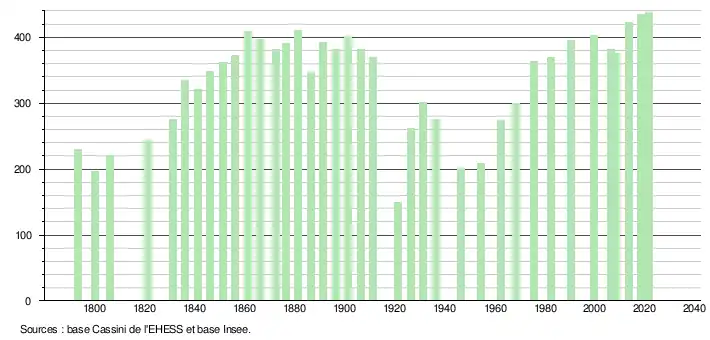 L'évolution du nombre d'habitants est connue à travers les recensements de la population effectués dans la commune depuis 1793. Pour les communes de moins de 10 000 habitants, une enquête de recensement portant sur toute la population est réalisée tous les cinq ans, les populations légales des années intermédiaires étant quant à elles estimées par interpolation ou extrapolation[24]. Pour la commune, le premier recensement exhaustif entrant dans le cadre du nouveau dispositif a été réalisé en 2008[25].