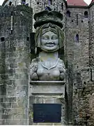 - À l'entrée du pont-levis, le buste giron de Dame Carcas accueille les visiteurs. Il s'agit d'une réplique. L'original sculpté au XVIe siècle, est conservé au château comtal.