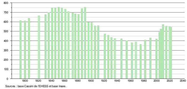 L'évolution du nombre d'habitants est connue à travers les recensements de la population effectués dans la commune depuis 1793. Pour les communes de moins de 10 000 habitants, une enquête de recensement portant sur toute la population est réalisée tous les cinq ans, les populations légales des années intermédiaires étant quant à elles estimées par interpolation ou extrapolation[18]. Pour la commune, le premier recensement exhaustif entrant dans le cadre du nouveau dispositif a été réalisé en 2004[19].