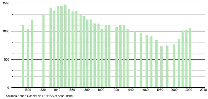 | L'évolution du nombre d'habitants est connue à travers les recensements de la population effectués dans la commune depuis 1793. Pour les communes de moins de 10 000 habitants, une enquête de recensement portant sur toute la population est réalisée tous les cinq ans, les populations légales des années intermédiaires étant quant à elles estimées par interpolation ou extrapolation[33]. Pour la commune, le premier recensement exhaustif entrant dans le cadre du nouveau dispositif a été réalisé en 2006[34]. En 2021, la commune comptait 1 054 habitants[Note 8], en augmentation de 3,13 % par rapport à 2015 (Tarn : +1,82 %, France hors Mayotte : +1,84 %). |