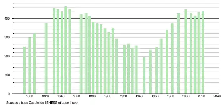 L'évolution du nombre d'habitants est connue à travers les recensements de la population effectués dans la commune depuis 1793. Pour les communes de moins de 10 000 habitants, une enquête de recensement portant sur toute la population est réalisée tous les cinq ans, les populations légales des années intermédiaires étant quant à elles estimées par interpolation ou extrapolation[17]. Pour la commune, le premier recensement exhaustif entrant dans le cadre du nouveau dispositif a été réalisé en 2006[18].