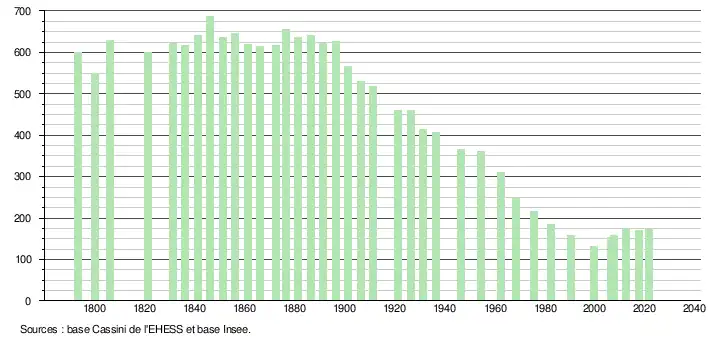 L'évolution du nombre d'habitants est connue à travers les recensements de la population effectués dans la commune depuis 1793. Pour les communes de moins de 10 000 habitants, une enquête de recensement portant sur toute la population est réalisée tous les cinq ans, les populations légales des années intermédiaires étant quant à elles estimées par interpolation ou extrapolation[21]. Pour la commune, le premier recensement exhaustif entrant dans le cadre du nouveau dispositif a été réalisé en 2007[22].