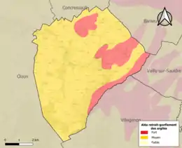 Le retrait-gonflement des sols argileux est susceptible d'engendrer des dommages importants aux bâtiments en cas d’alternance de périodes de sécheresse et de pluie. La totalité de la commune est en aléa moyen ou fort (90 % au niveau départemental et 48,5 % au niveau national). Sur les 168 bâtiments dénombrés sur la commune en 2019, 168 sont en aléa moyen ou fort, soit 100 %, à comparer aux 83 % au niveau départemental et 54 % au niveau national. Une cartographie de l'exposition du territoire national au retrait gonflement des sols argileux est disponible sur le site du BRGM[17],[Carte 2].